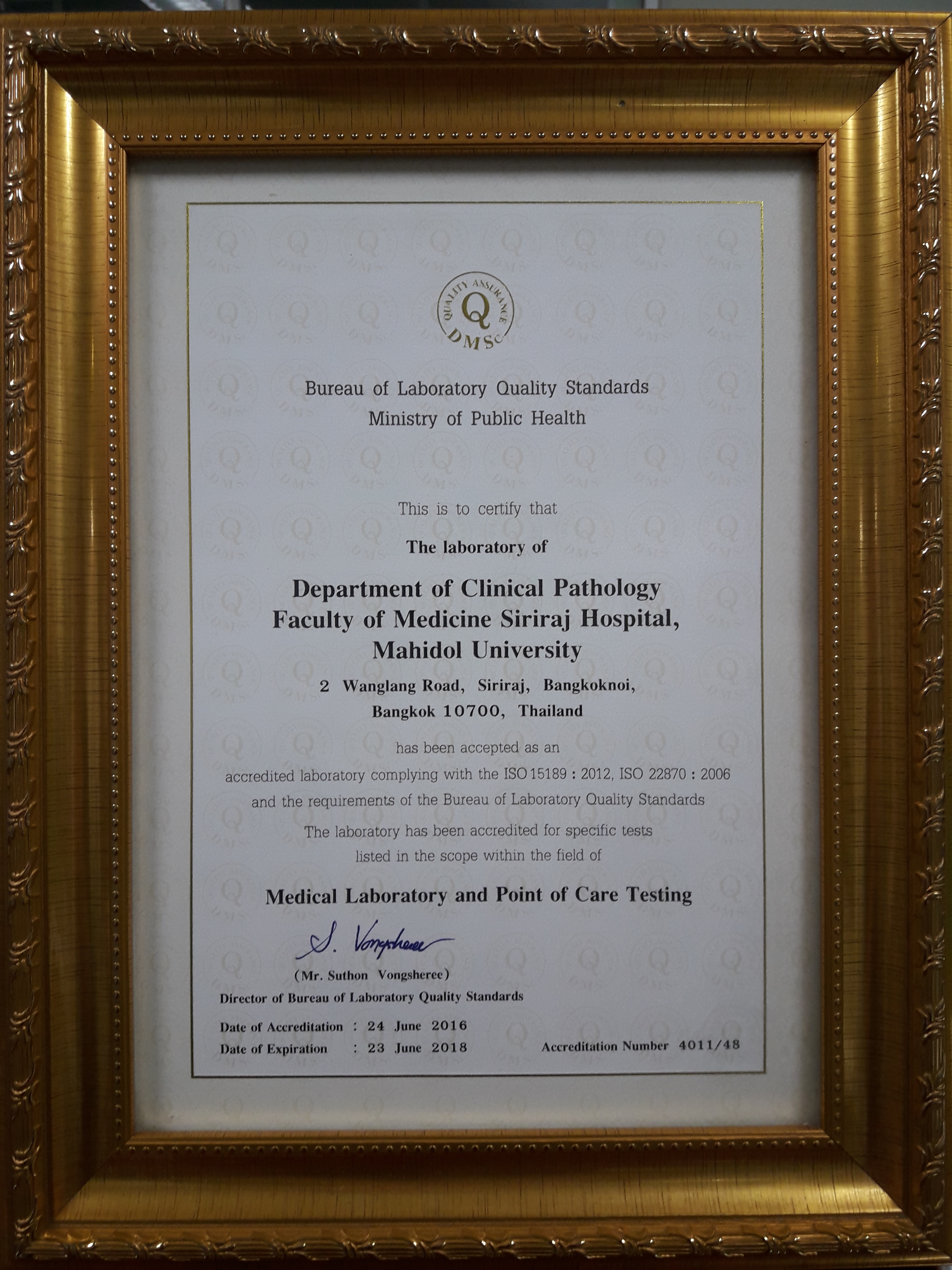 คณะแพทยศาสตร์ศิริราชพยาบาล มหาวิทยาลัยมหิดล ได้รับการรับรองความสามารถการตรวจ POCT Glucose มาตรฐานสากล ISO 22870 : 2006 No.4011/48 เมื่อวันที่ 24 มิถุนายน 2552 ปัจจุบันคณะฯ ได้รับการรับรองความสามารถการตรวจ POCT Glucose มาตรฐานสากล ISO 15189:2022